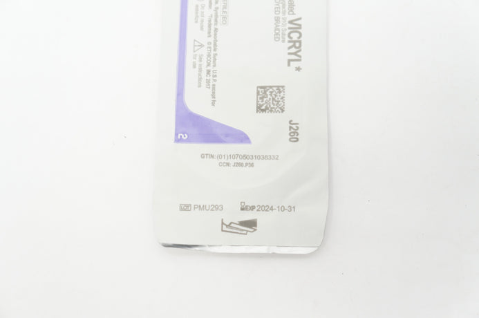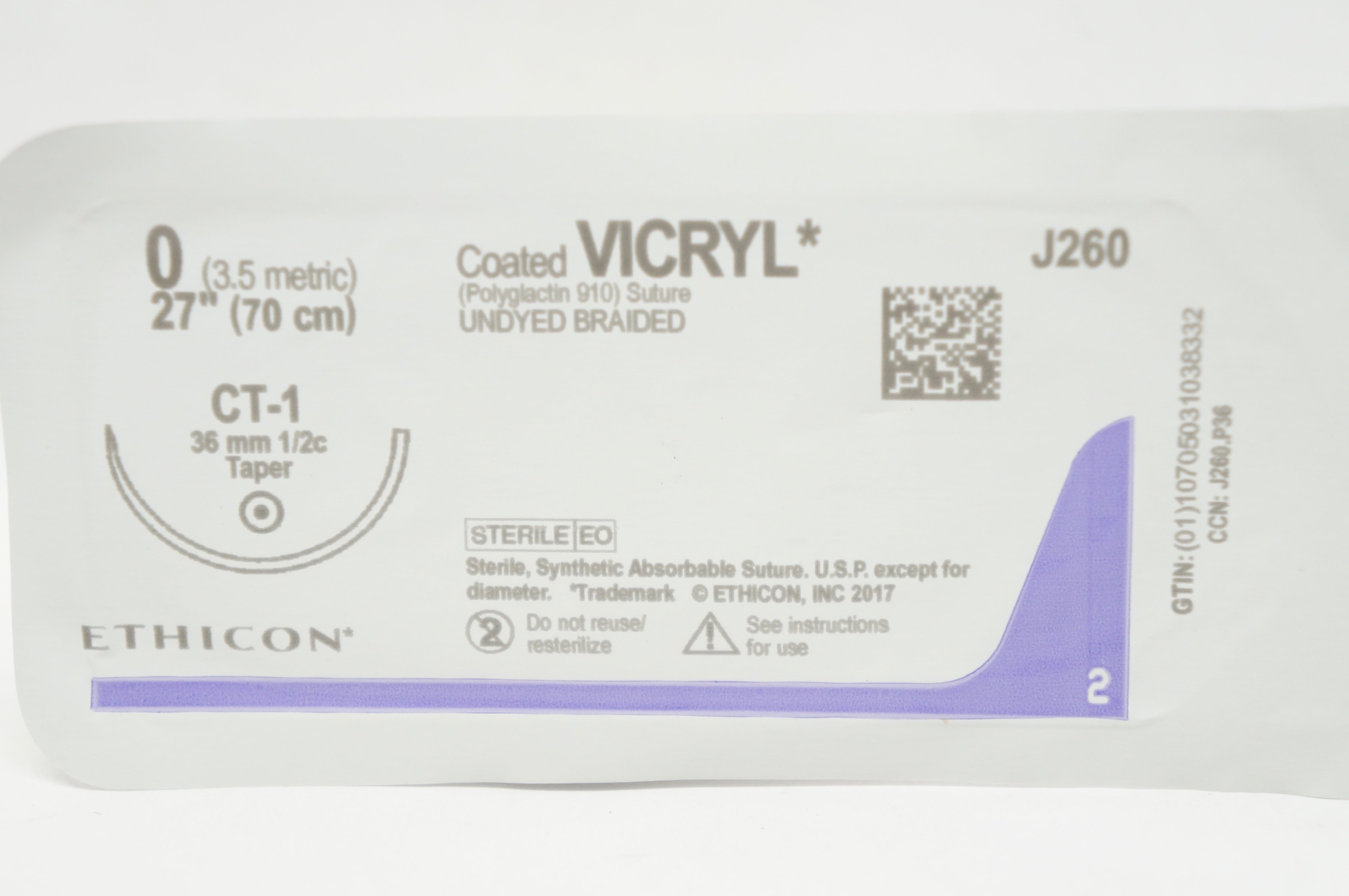 Ethicon J260 0 Coated VICRYL, Polyglactin 910 Suture Undyed Braided, CT-1 36mm 1/2c Taper 27 inch