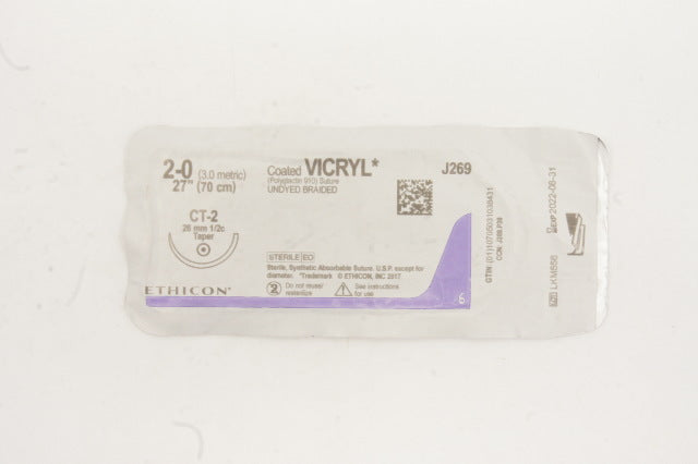 - Ethicon J269 2-0 Coated VICRYL Stre CT-2 26mm 1/2c Taper, 27inch