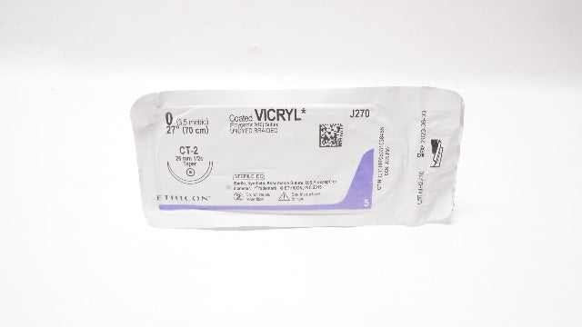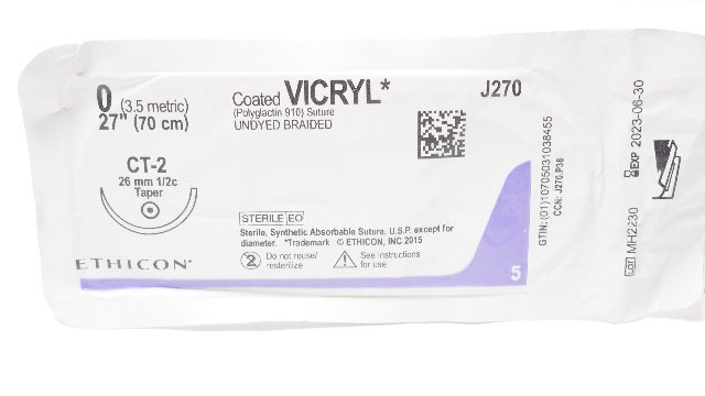- Ethicon J270 0 Coated VICRYL Stre, Undyed Braided, CT-2 26mm 1/2c Taper, 27inch