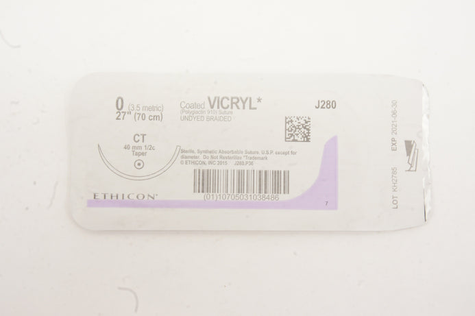 - Ethicon J280 0 VICRYL, CT, 40mm 1/2c Taper, 27inch