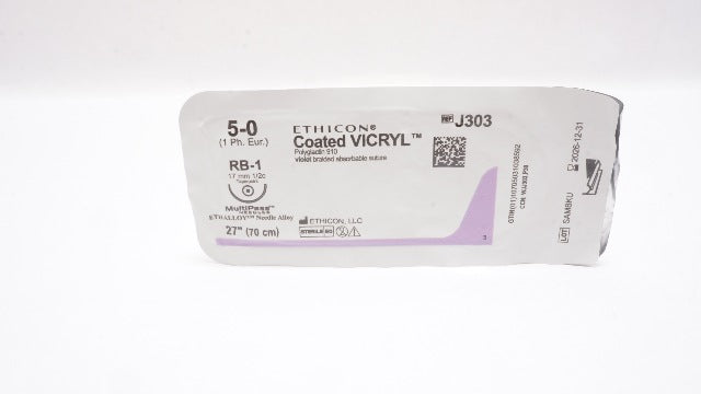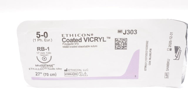 - Ethicon J303 5-0 Coated VICRYL, RB-1, 17mm 1/2c Taperpoint, 27inch