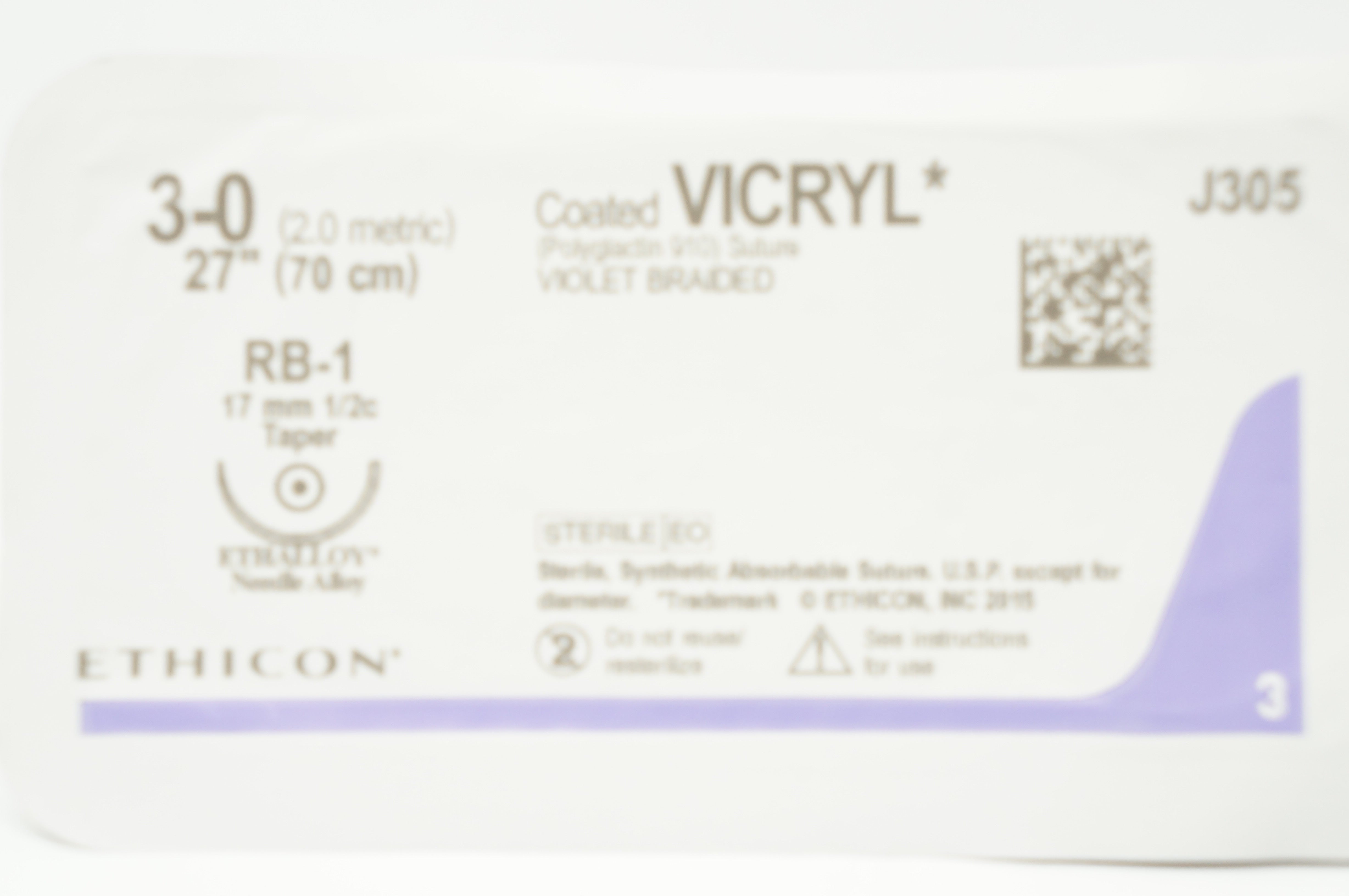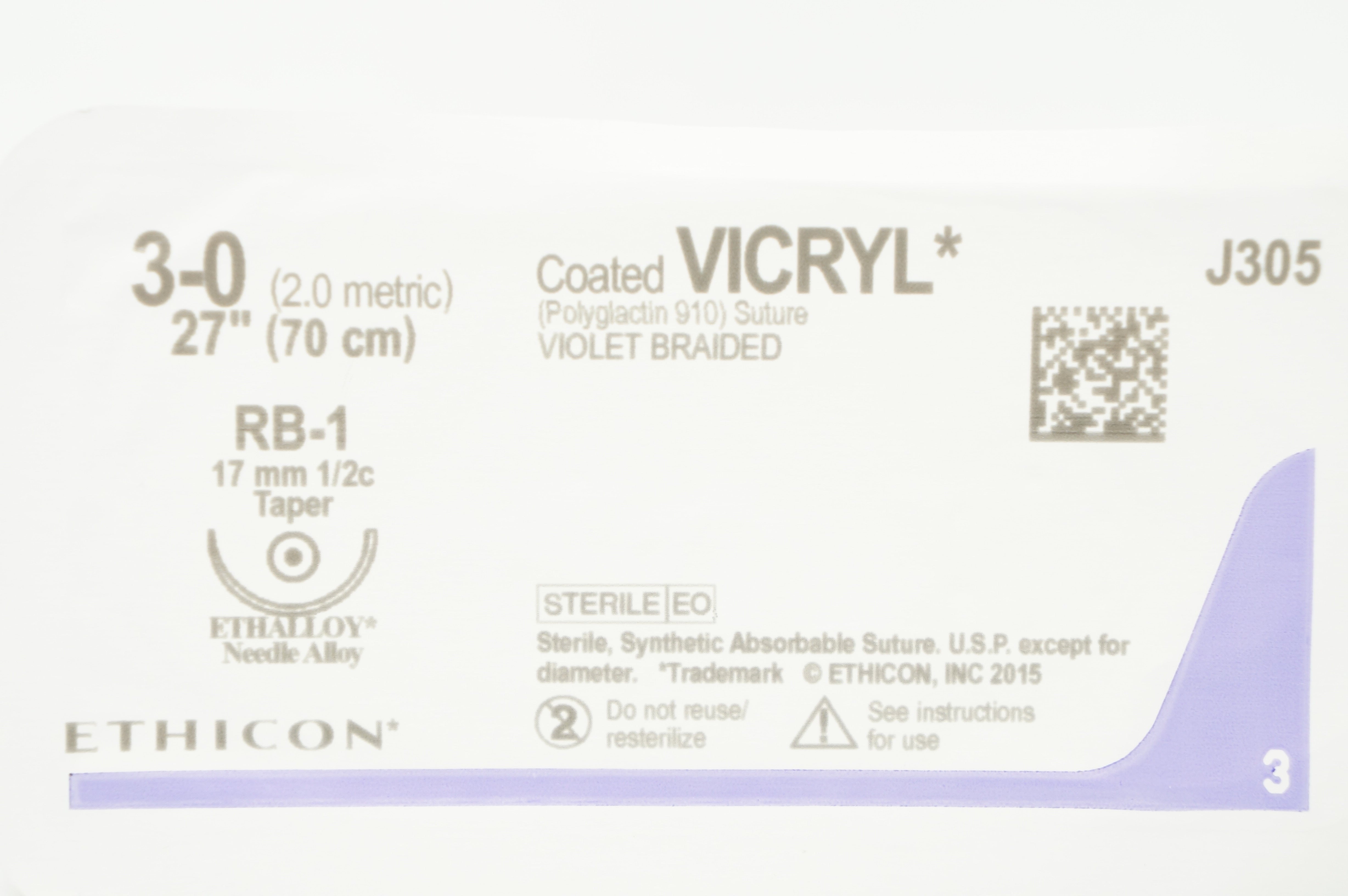 - Ethicon J305 3-0 Coated VICRYL Stre, Violet Braided RB-1 17mm 1/2c Taper, 27in.