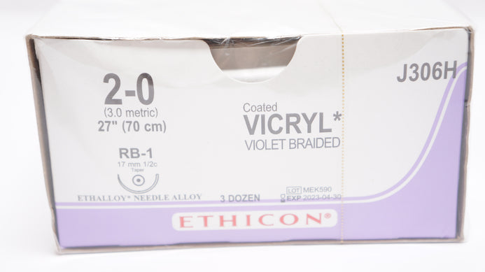 Ethicon J306H 2-0 Coated Vicryle, RB-1, 17mm 1/2c Taper, 27inch (x) - Box of 36