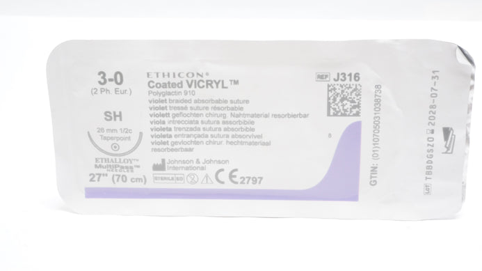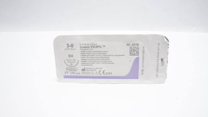 Ethicon J316 3-0 Coated VICRYL Polyglactin 910 Suture Violet Braided SH 26mm 1/2c Taperpoint 27inch