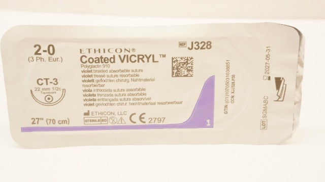 - Ethicon J328 2-0 Coated VICRYL Polyglactin Stre CT-3 22mm 1/2c Taperpoint 27inch