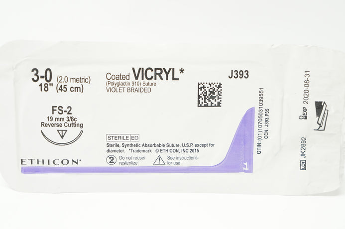 - Ethicon J393 3-0 Coated VICRYL Stre, FS-2 19mm 3/8c Reverse Cutting, 18inch (x)