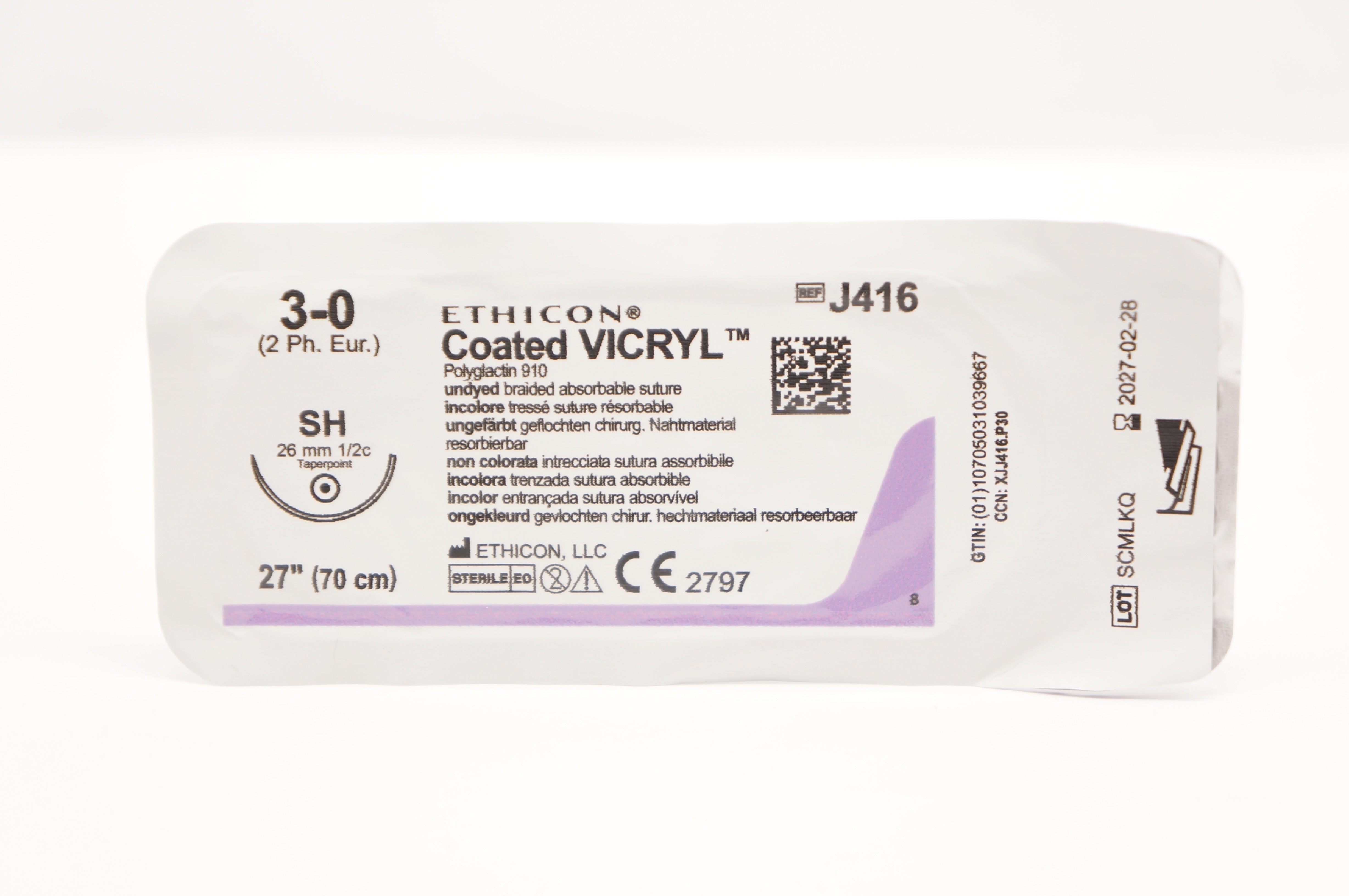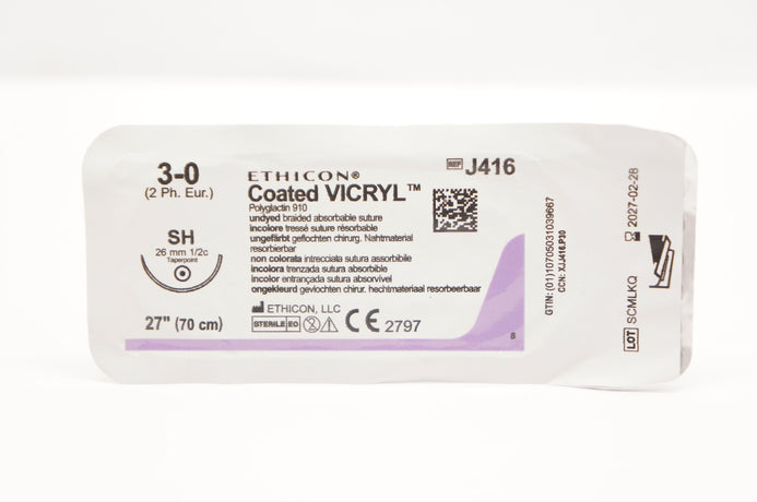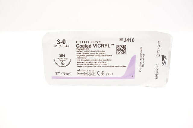 - Ethicon J416 3-0 Coated VICRYL Absorbable Stre SH, 26mm 1/2c Taperpoint, 27inch