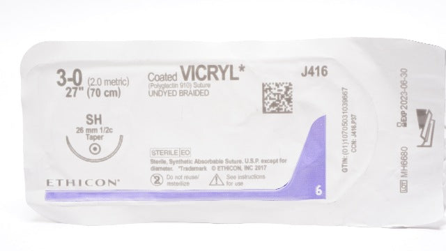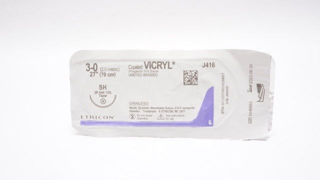 - Ethicon J416 3-0 Coated VICRYL Polyglactin Stre,SH 26mm 1/2c Taperpoint,27in (x)