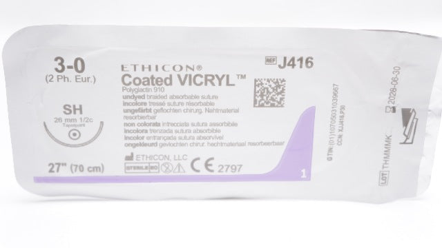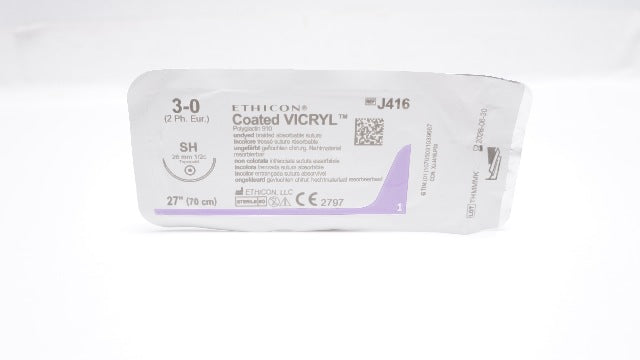 Ethicon J416 3-0 Coated Vicryl Polyglactin 910 Suture Undyed Braided SH 26mm 1/2c Taperpoint 27 inch