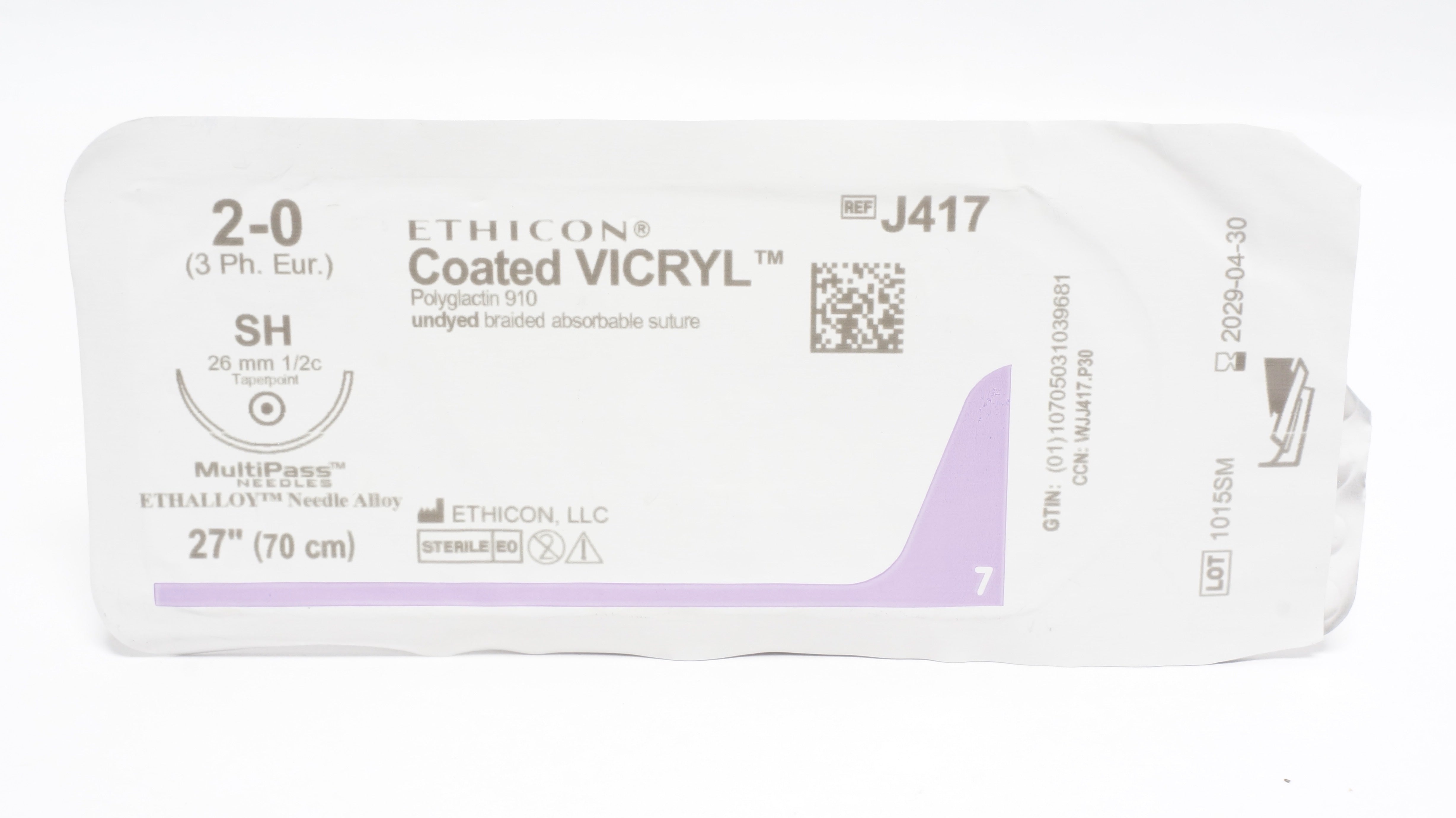 Ethicon J417 2-0 Coated VICRYL Polyglactin Stre SH 26mm 1/2c Taperpoint 27inch