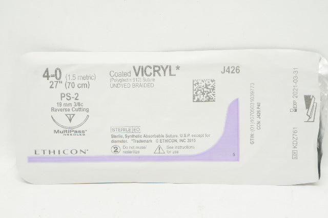 - Ethicon J426 4-0 Coated VICRYL Stre PS-2 19mm 3/8c Reverse Cutting, 27inch (x)