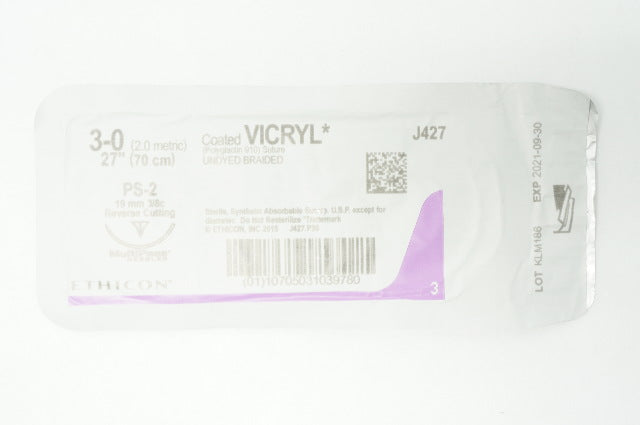 Ethicon J427 3-0 VICRYL PS-2, 19mm 3/8c Reverse Cutting, 27 inch