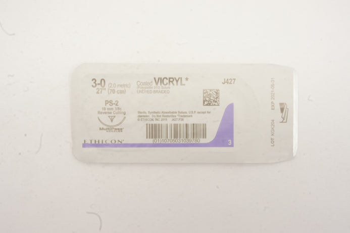 - Ethicon J427 3-0 VICRYL PS-2 19mm 3/8c Reverse Cutting 27 inch (x)