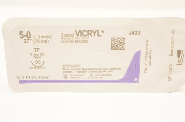 - Ethicon J433 5-0 Coated Vicryl Stre Undyed Braided TF 13mm 1/2c Taper 27 inch(x)