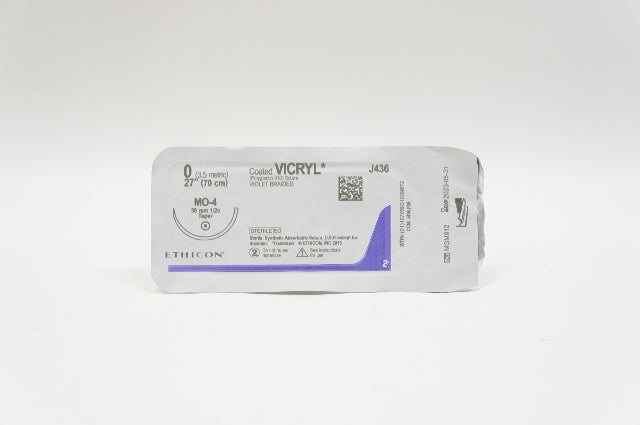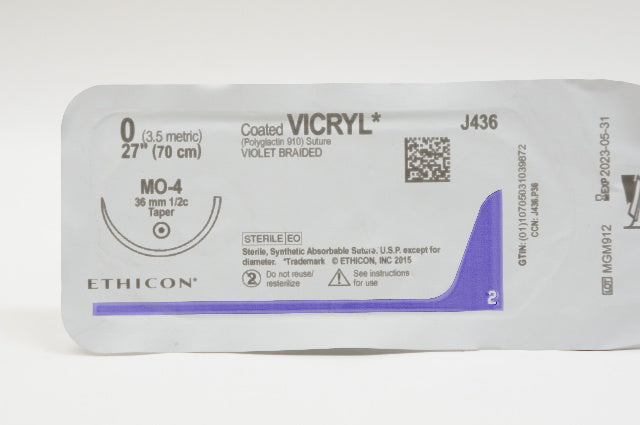 Ethicon J436 0 Coated VICRYL Polyglactin 910 Suture Violet Braided MO-4 36mm 1/2c Taper 27inch