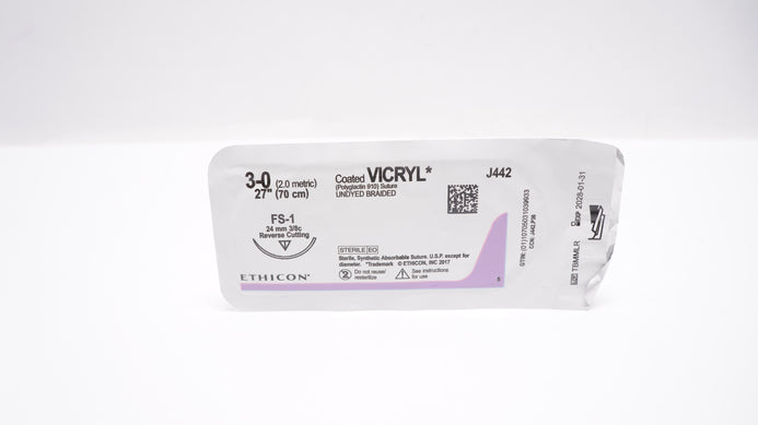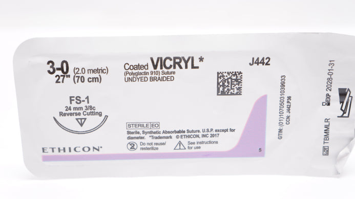 - Ethicon J442 3-0 Coated VICRYL Stre FS-1 24mm 3/8c Reverse Cutting, 27inch