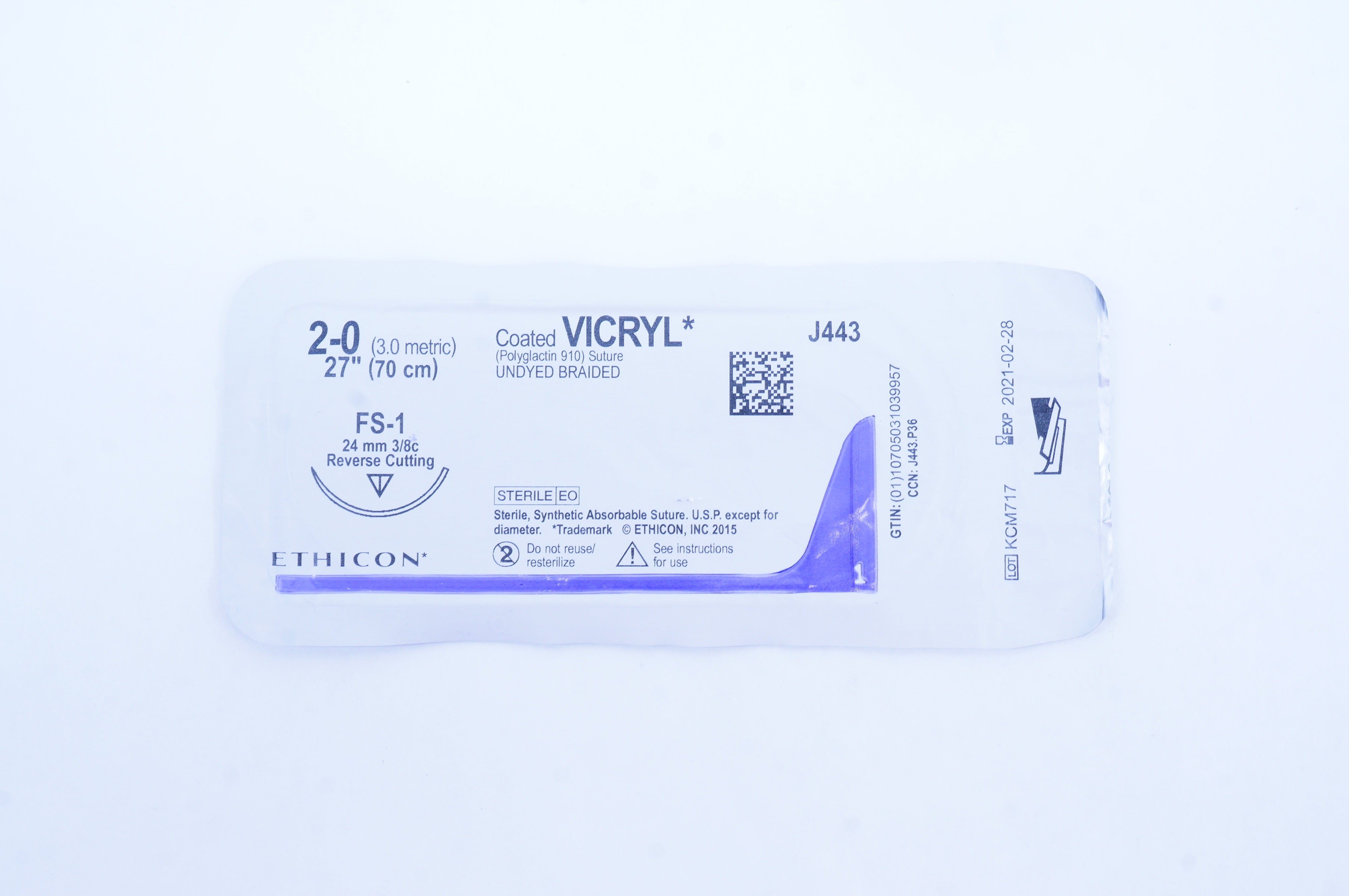 Ethicon J443 2-0 Coated VICRYL (Polyglactin 910) Suture Undyed Braided FS-1 24mm 3/8c Reverse Cutting, 27 inch
