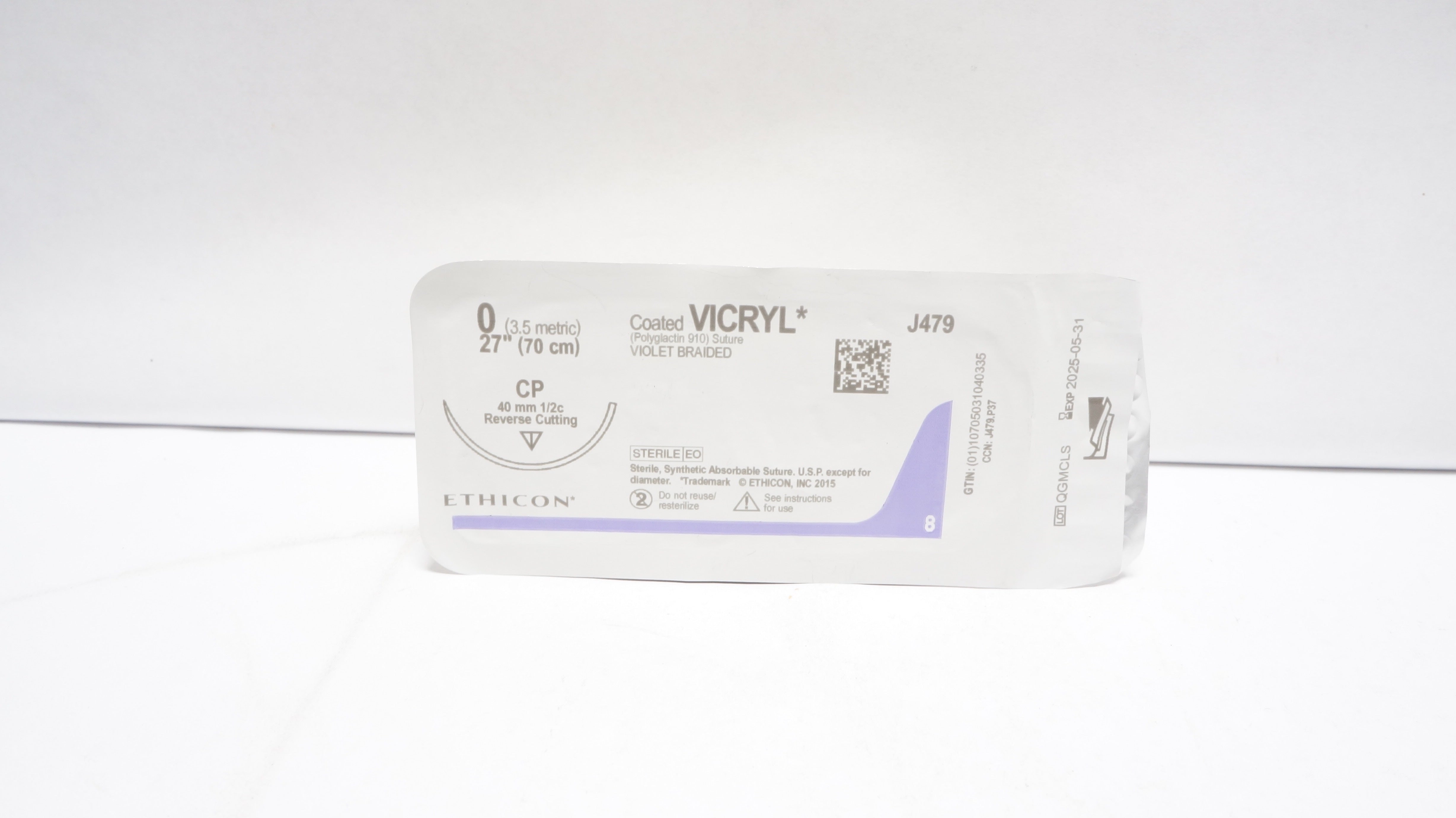 - Ethicon J479 0 VICRYL, CP, 40mm 1/2c Reverse Cutting, 27inch (x)