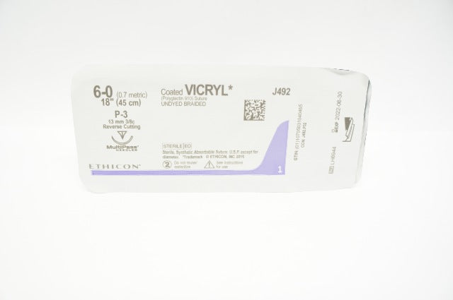 - Ethicon J492 6-0 Coated VICRYL, P-3, 13mm 3/8c Reverse Cutting, 18inch (x)