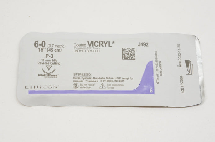 - Ethicon J492 6-0 VICRYL, P-3, 13mm 3/8c Reverse Cutting, 18inch
