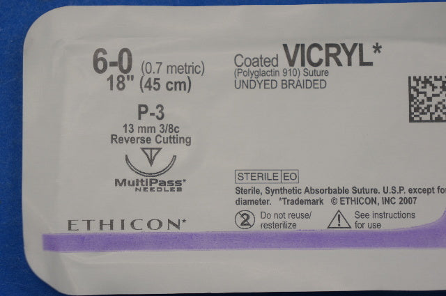 - Ethicon J492 6-0 VICRYL, P-3 13mm 3/8c Reverse Cutting, Undyed Braided, 18