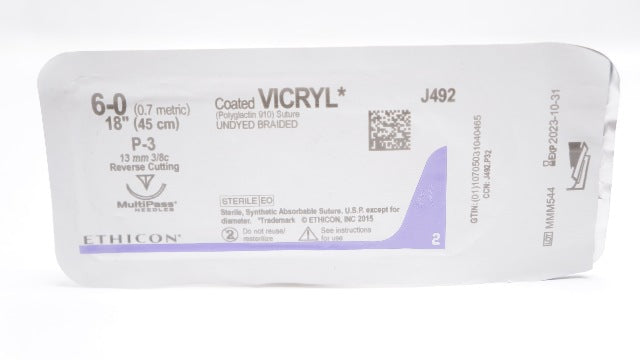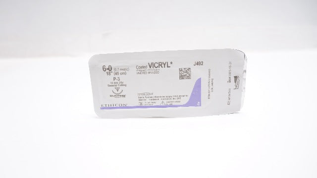 Ethicon J492 6-0 Coated VICRYL Polyglactin 910 Suture Undyed Braided P-3 13mm 3/8c Reverse Cutting, 18inch