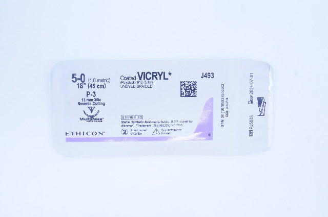 - Ethicon J493 5-0 Coated VICRYL Stre P-3 13mm 3/8c Reverse Cutting, 18inch