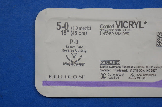 - Ethicon J493 5-0 VICRYL, P-3 13mm 3/8c Reverse Cutting, Undyed Braided, 18inch