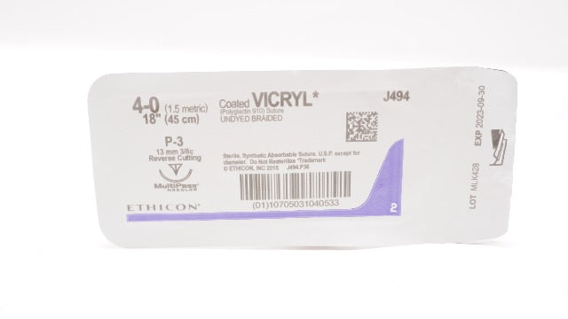 - Ethicon J494 4-0 VICRYL, P-3, 13mm 3/8c, 18inch (x)