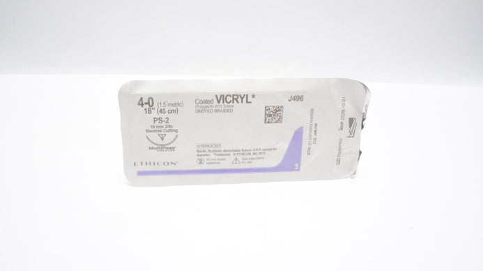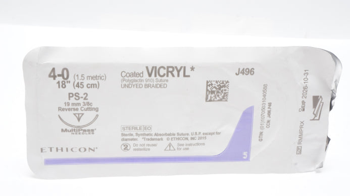 - Ethicon J496 4-0 Coated VICRYL Stre PS-2 19mm 3/8c Reverse Cutting, 18inch