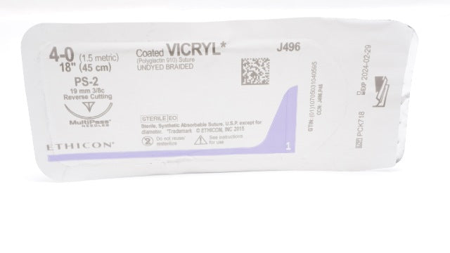 Ethicon J496 4-0 Coated VICRYL Stre PS-2 19mm 3/8c Reverse Cutting 18inch