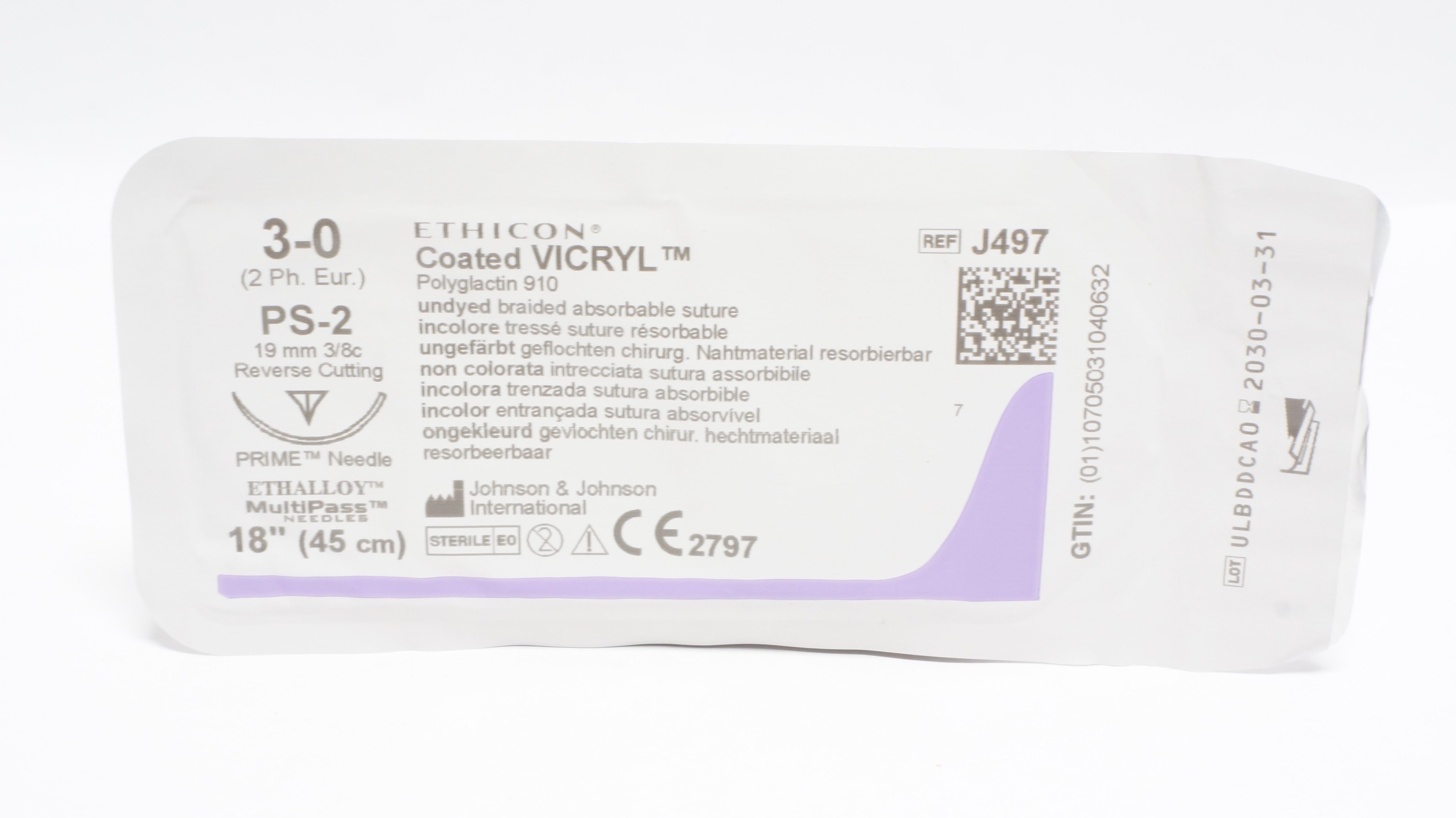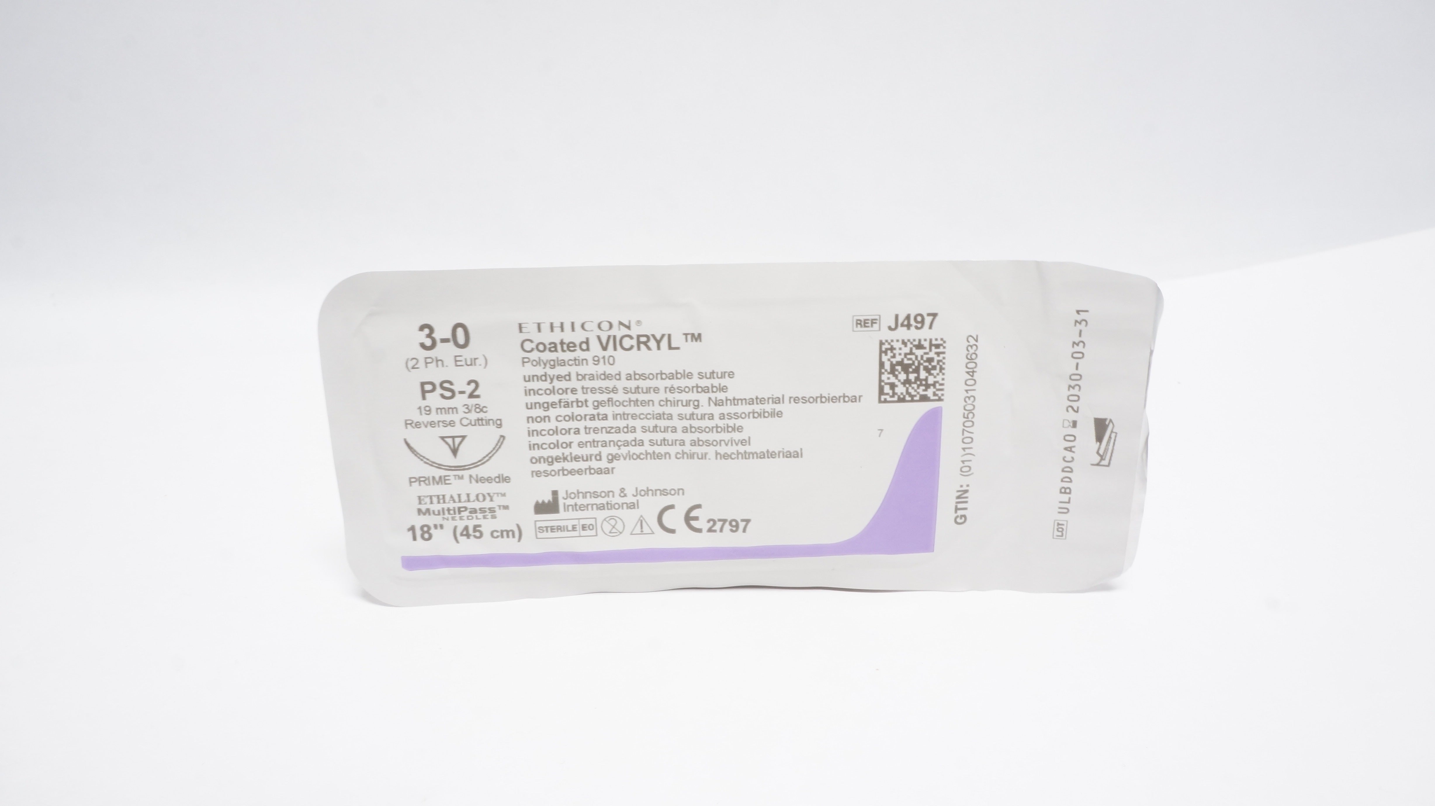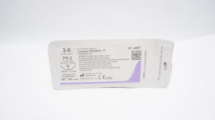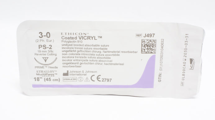 - Ethicon J497 3-0 Coated VICRYL Stre PS-2 19mm 3/8c Reverse Cutting 18 inch