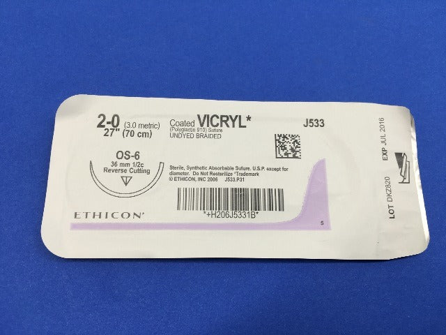 Ethicon J533H Coated VICRYL, Reverse Cutting, Absorbable, OS-6 36mm, Undyed Braided 27" 70cm, Size: 2-0