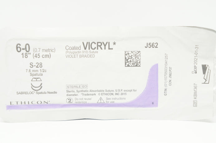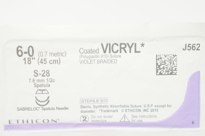 - Ethicon J562 6-0 Coated VICRYL Stre S-28 7.6mm 1/2c Spatula, 18inch (x)