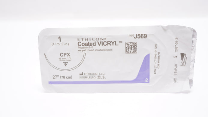 Ethicon J569 1 Coated VICRYL Polyglactin 910 Undyed Braided Suture CPX 48mm 1/2c Reverse Cutting, 27inch