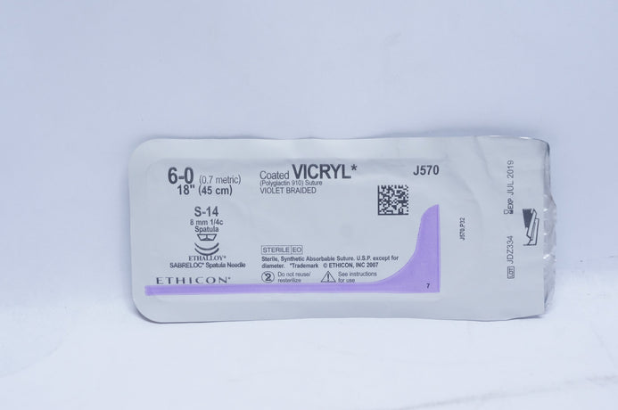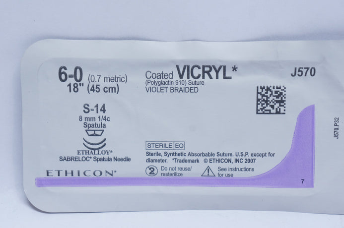 - Ethicon J570 6-0 VICRYL, S-14, 8mm 1/4c Spatula, 18inch (x)