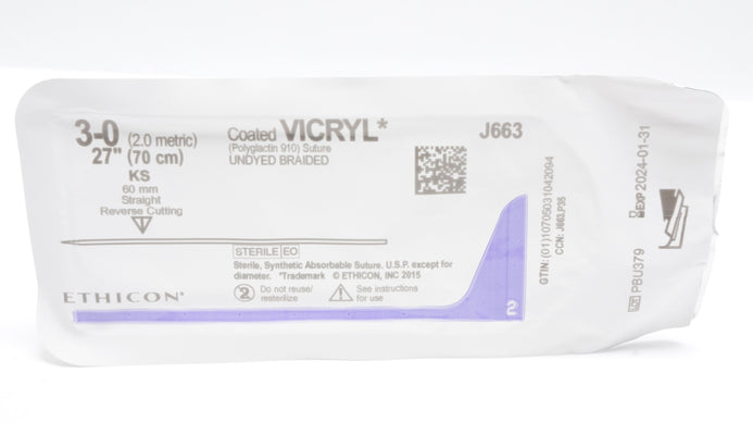 Ethicon J663 3-0 Coated VICRYL Stre KS 60mm Straight Reverse Cutting, 27inch (x)