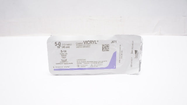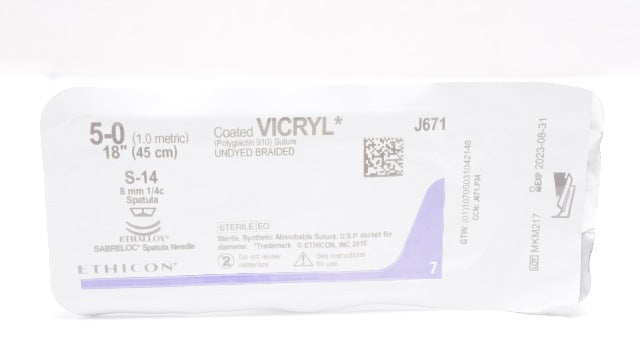 - Ethicon J671 5-0 Coated VICRYL Polyglactin Stre S-14 8mm 1/4c Spatula, 18inch(x)