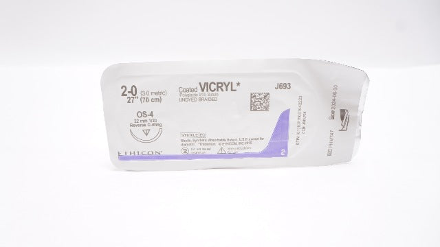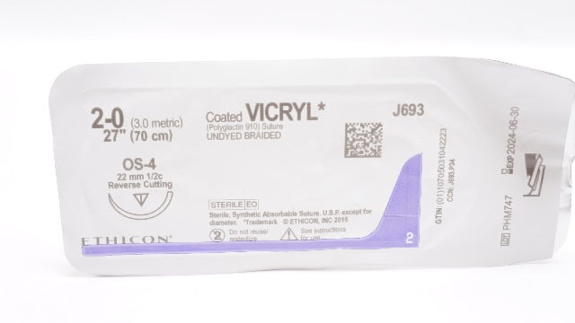 Ethicon J693 2-0 Coated Vicryl Polyglactin 910 Suture Undyed Braided OS-4 22mm 1/2c Reverse Cutting 27inch