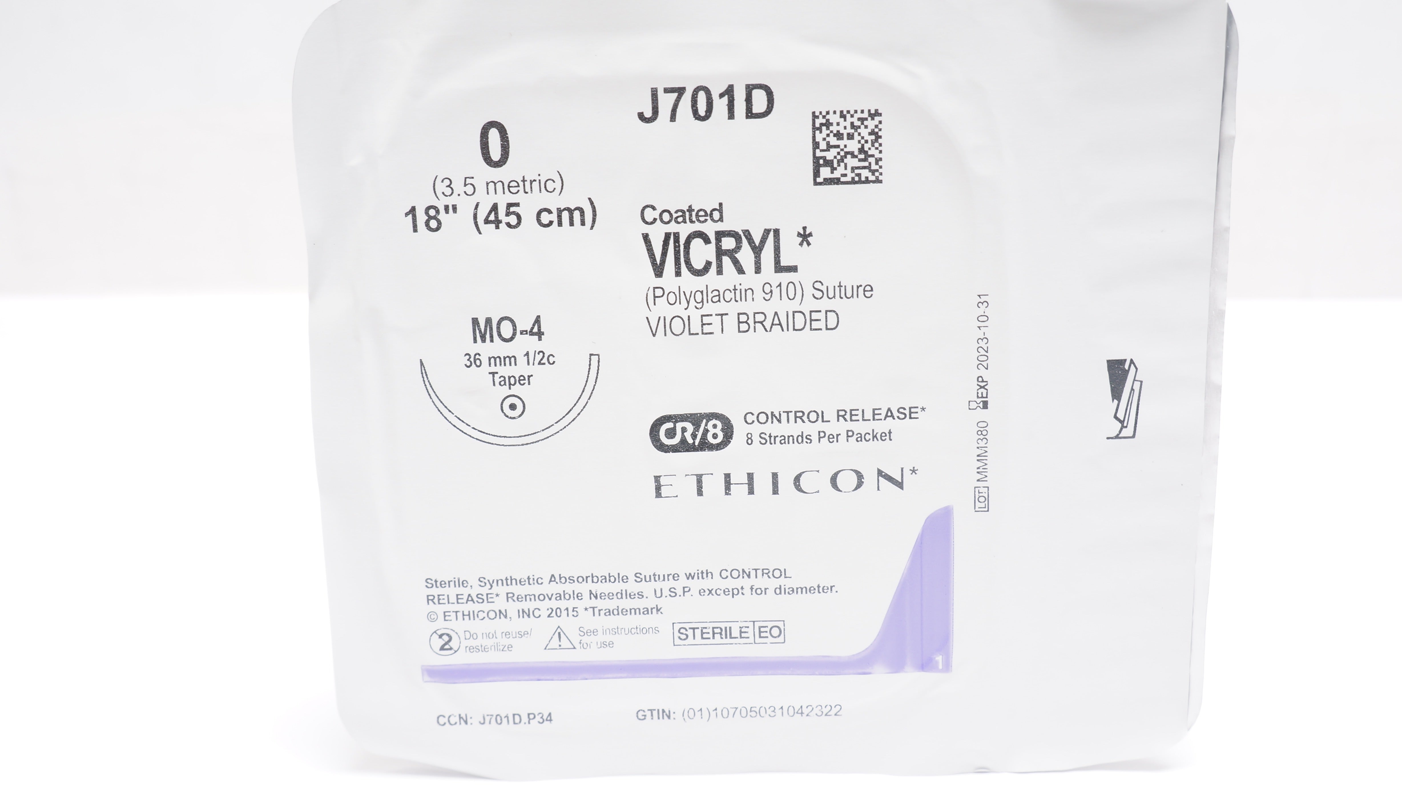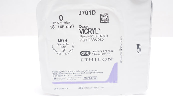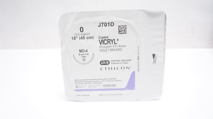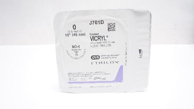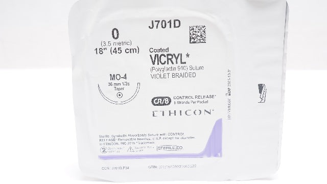 - Ethicon J701D 0 Coated VICRYL Polyglavtin Stre MO-4 36mm 1/2c Taper, 18inch (x)