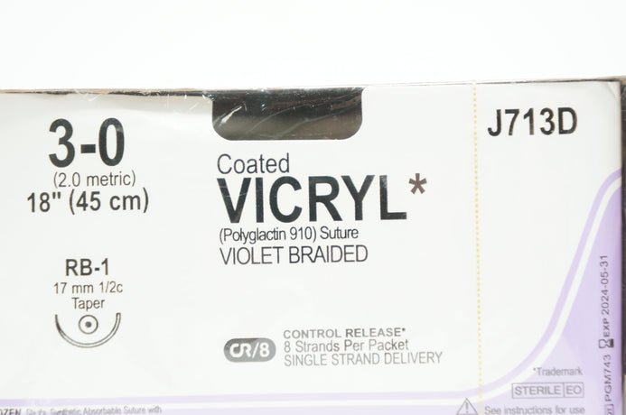 - Ethicon J713D 3-0 VICRYL RB-1 17mm 1/2c Taper 18 in CR/8 - Box of 12