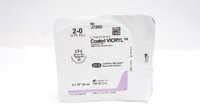 - Ethicon J726D 2-0 Coated VICRYL Stre CT-2 26mm 1/2c Taperpoint, 8 x 18inch