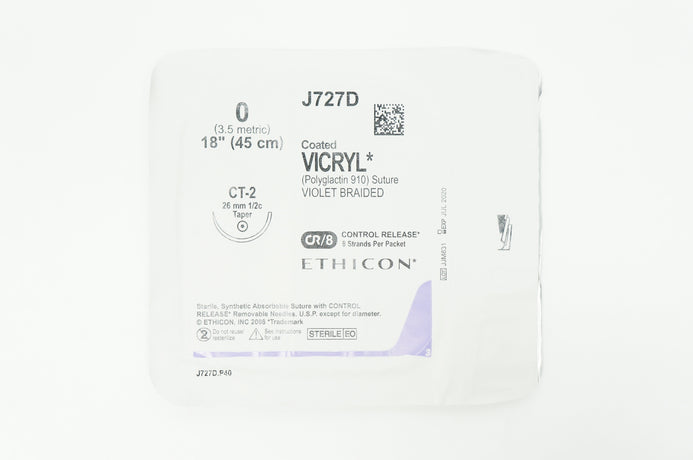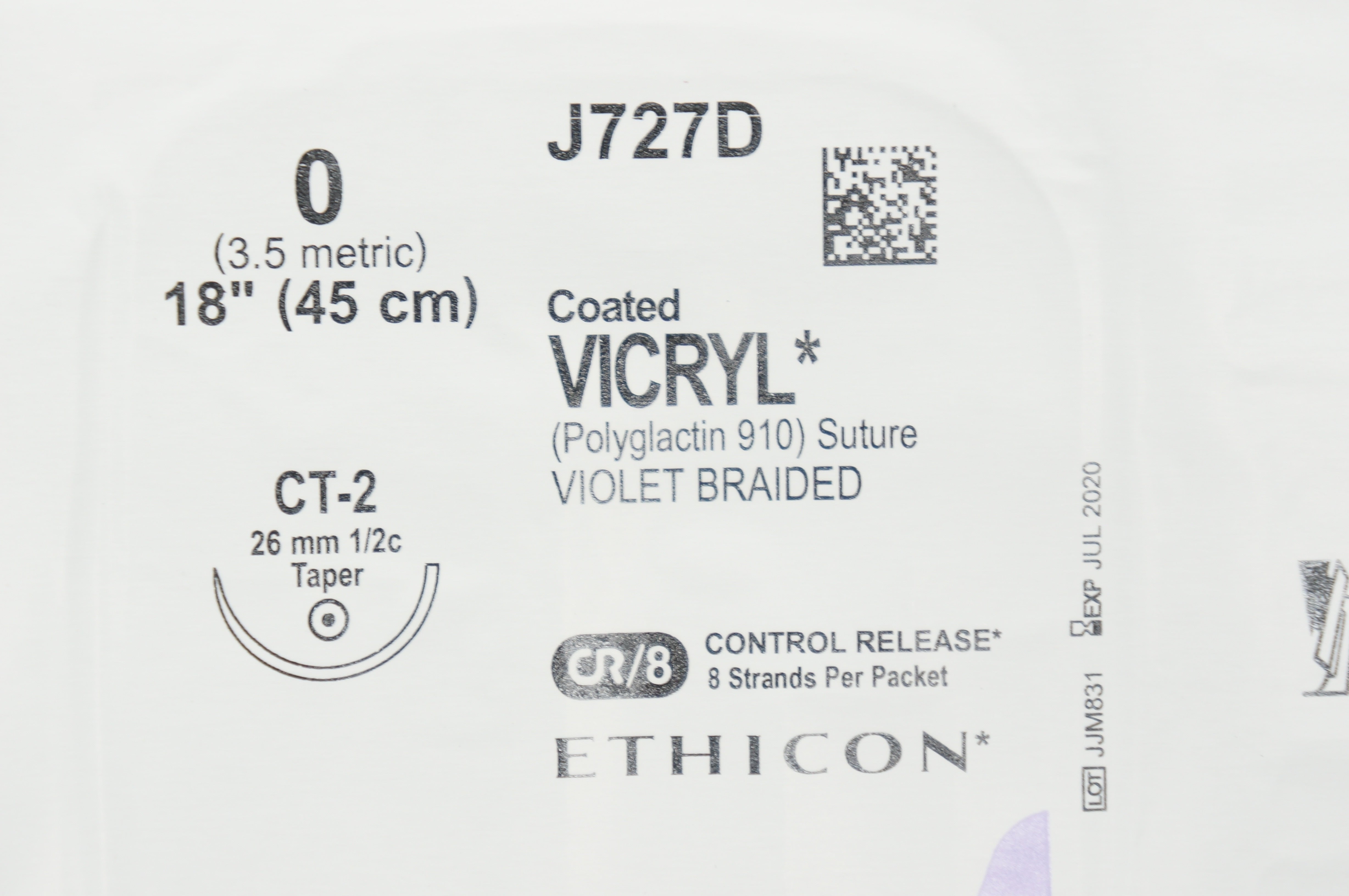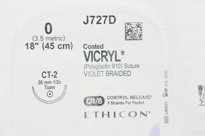 Ethicon J727D 0 Coated VICRYL (Polyglactin 910) Suture Violet Braided CT-2 26mm 1/2c Taper 18inch CR/8 Control Release
