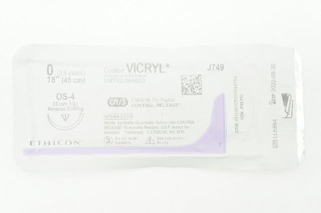 - Ethicon J749 0 VICRYL OS-4, 22mm 1/2c Reverse Cutting, 18 inch