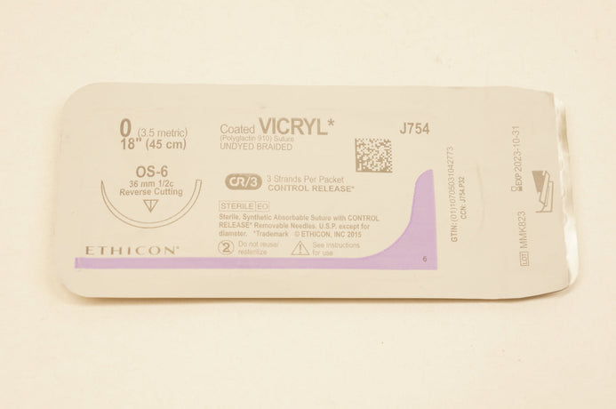 Ethicon J754 0 VICRYL, OS-6, 36mm 1/2c Reverse Cutting, 18inch