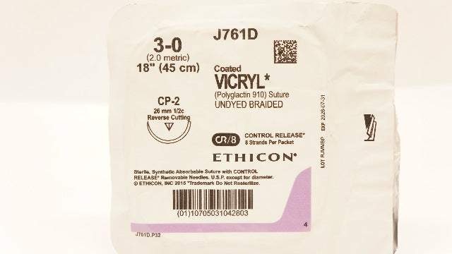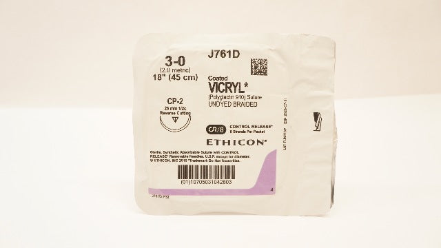 - Ethicon J761D 3-0 Coated VICRYL Stre CP-2 26mm 1/2c Reverse Cutting, 18inch