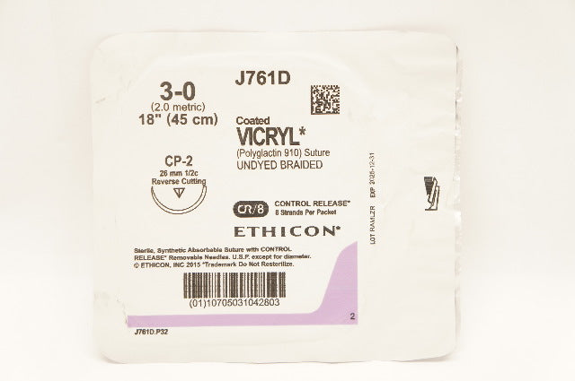 - Ethicon J761D Coated Vicryl Stre CP-2 26mm 1/2c Reverse Cutting 3-0 18in.