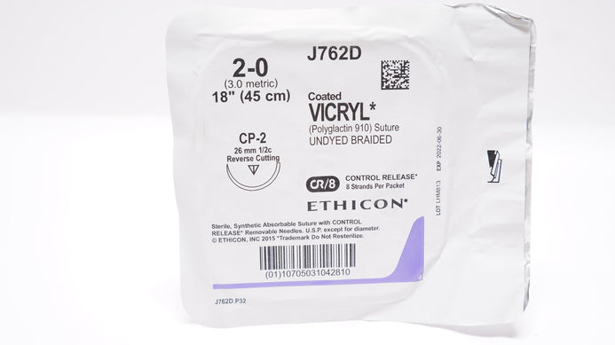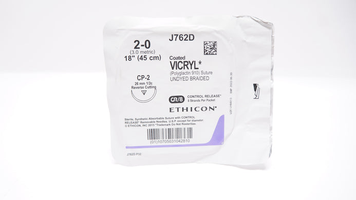 - Ethicon J762D 2-0 Coated VICRYL, CP-2, 26mm 1/2c Reverse Cutting, 18inch (x)