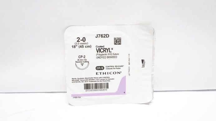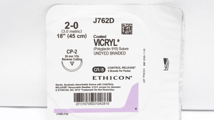 - Ethicon J762D 2-0 Coated VICRYL Stre CP-2 26mm 1/2c Reverse Cutting 18inch