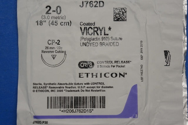 Ethicon J762D 2-0 VICRYL, CP-2 26mm 1/2c Reverse Cutting, Undyed Braided, 18"
